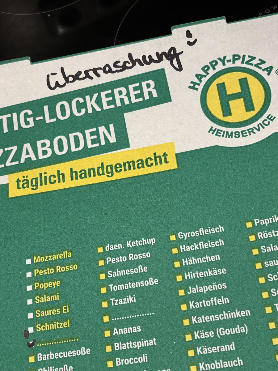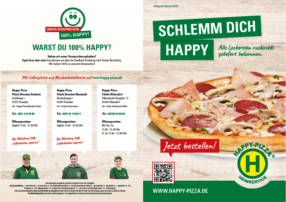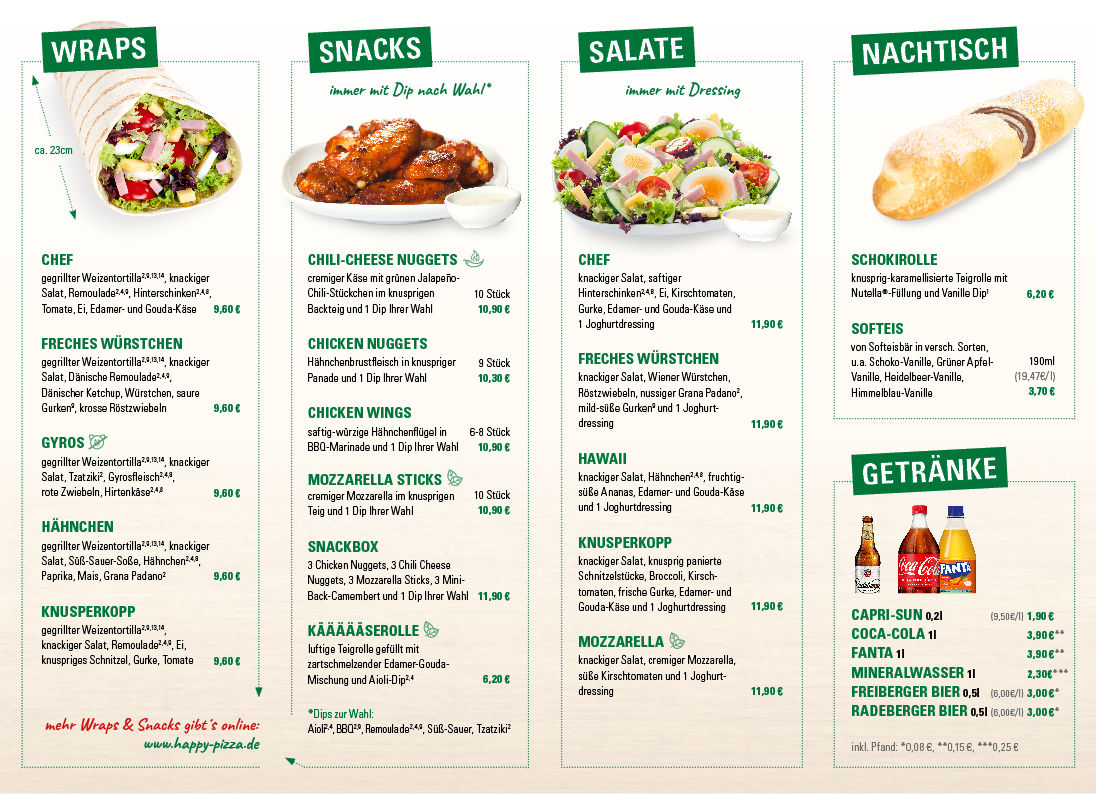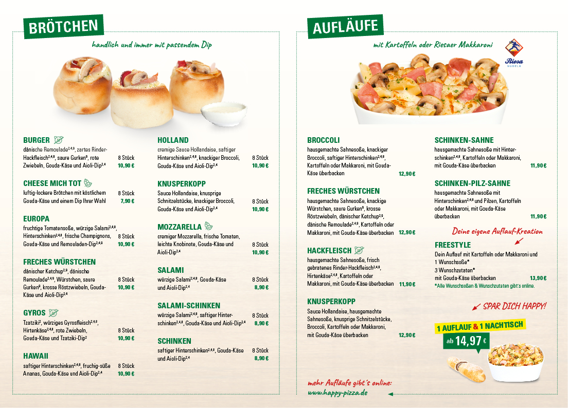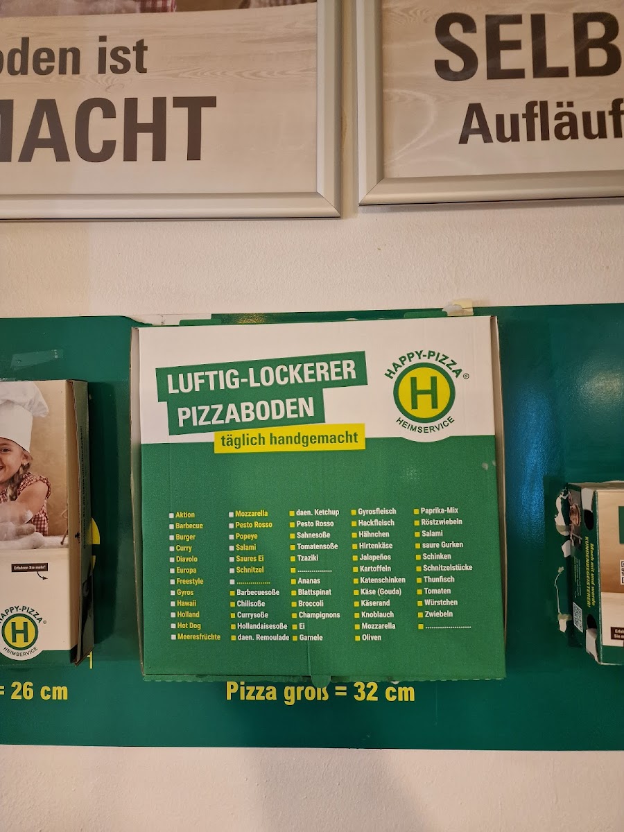 From a reviewer’s perspective, the menu at Happy Pizza Dresden Seidnitz keeps things simple but satisfying, with a focus on creative, fast-food-inspired pizza options and a varied bread roll selection. The HANDGEMACHTE PIZZA (26cm) section stands out with unusual choices like BARBECUE, BURGER, and HOT DOGMOZZARELLA, offering a playful twist on classic pizza flavors that will likely appeal to those looking for something different from traditional toppings. In addition, the RIESEN BRÖTCHENAUSWAHL provides more variety with options such as DIAVOLO and EUROPA, giving customers alternatives if they prefer sandwiches over pizza. Overall, the menu may not be huge, but the distinctive names and casual comfort-food style make it appealing for a quick, filling meal, especially for those who enjoy bold, familiar flavors presented in a fun way.